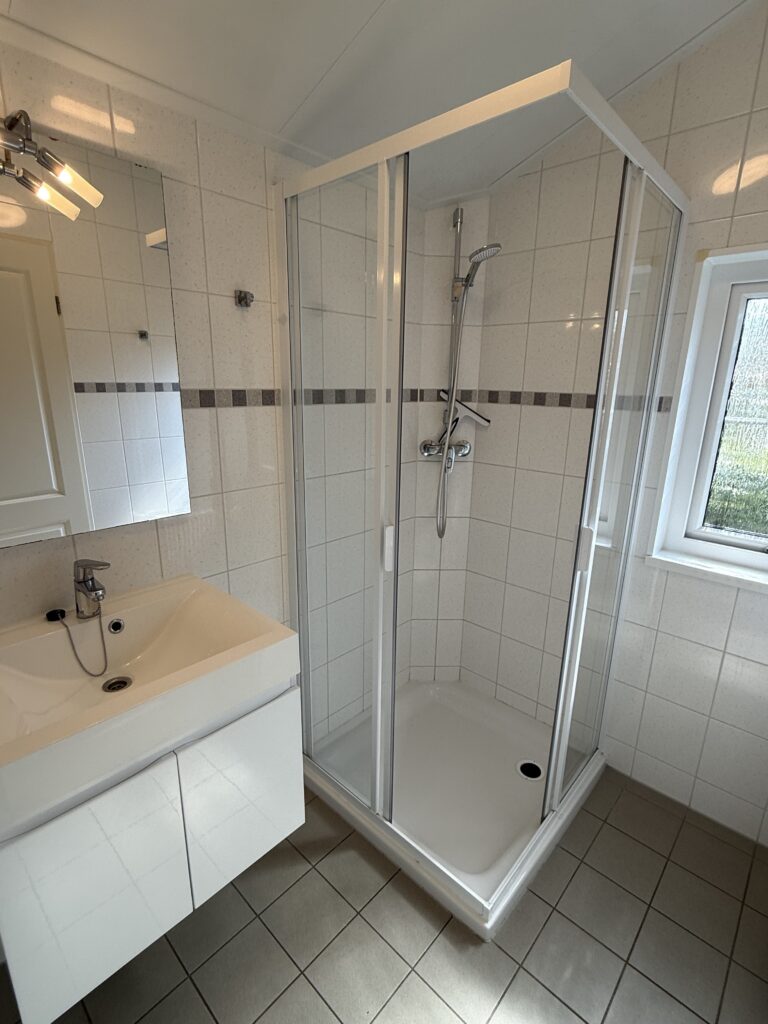 - Badkamer voorzieningen: Douche, wastafelmeubel, toilet